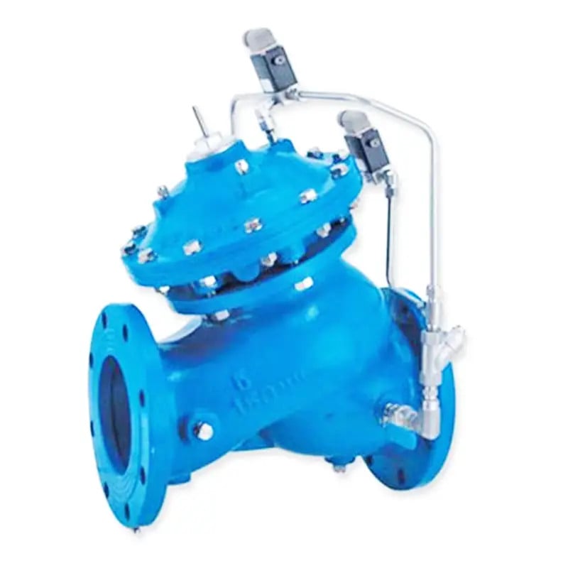 In cases where pipeline water is contaminated (corrosive, debris laden) external control fluid is often used. For 10″ and larger valves, an accelerator quickens valve response. For 10″ and larger valves, a single solenoid commands two accelerators & (replacing solenoids used for the smaller valves) to powerfully open and close the main valve.