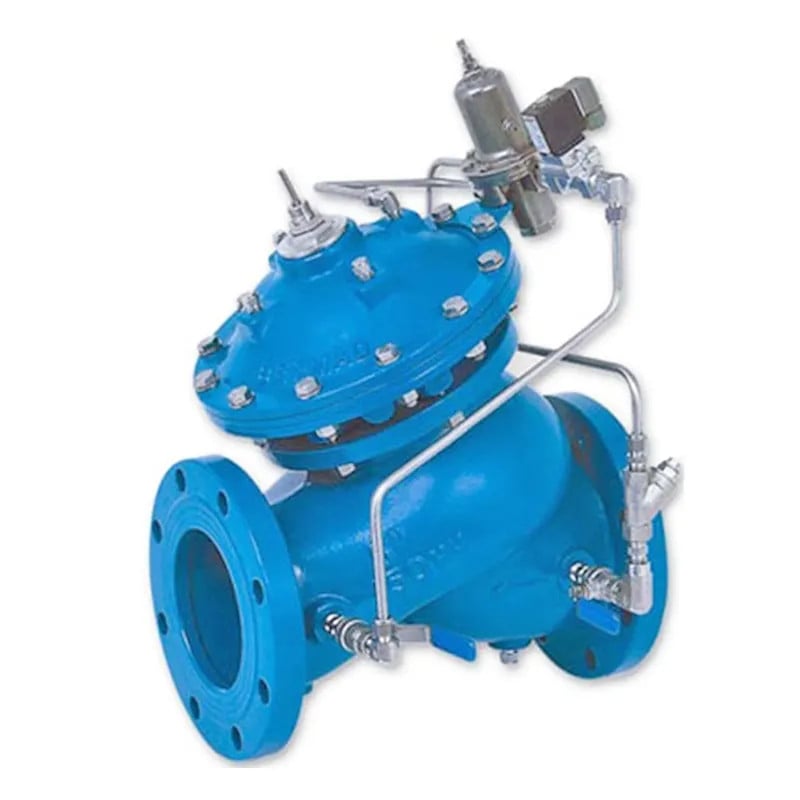 Should upstream pressure rise above the pilot setting, the pilot releases accumulated pressure and the main valve modules open. Should the solenoid pilot closes, pressure in the upper control-chamber accumulates causing the main valve to shut off. Normally closed, normally open and last position models are available.
