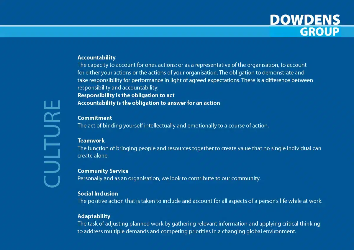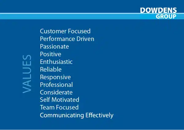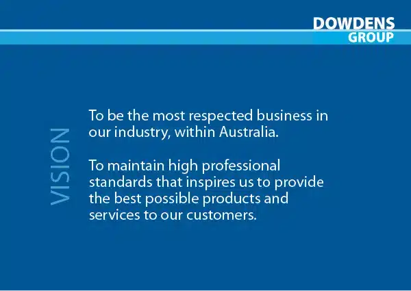 Dowdens Group’s core principles revolve around a strong foundation of accountability, teamwork, and community service. We are driven by a vision to be the most respected business in our industry within Australia, upholding high professional standards to consistently deliver the best products and services to our customers.