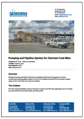 Dowdens Pumping and Water Treatment successfully installed and commissioned a unique containerised pumping pipeline system for the In-Pit Crushing Conveyor (IPCC) and dump conveyor system at Rio Tinto’s Clermont Thermal Coal Mine.