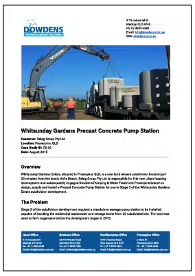 Whitsunday Gardens Estate, situated in Proserpine, QLD, is a new land release subdivision located just 25 minutes from the iconic Airlie Beach. Relag Group Pty Ltd is responsible for this new urban housing development and subsequently engaged Dowdens Pumping & Water Treatment Proserpine branch to design, supply and install a Precast Concrete Pump Station for use in Stage 3 of the Whitsunday Gardens Estate subdivision development.