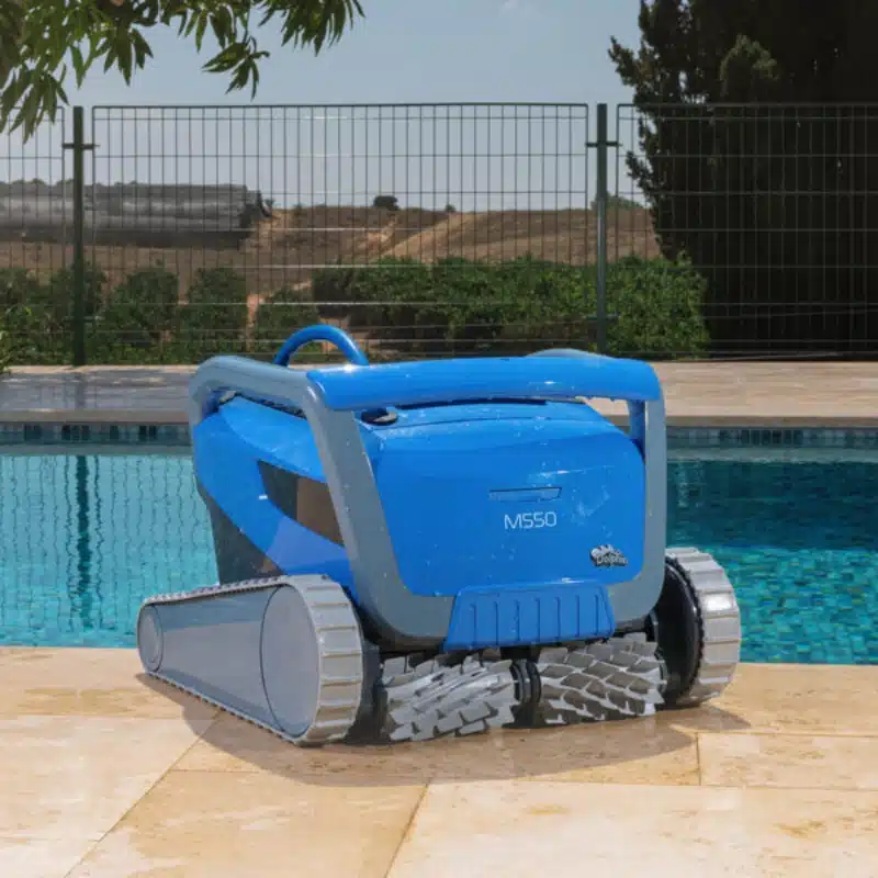Maytronics Dolphin M 550 robotic pool cleaner for pools up to 15m featuring Wi-Fi connectivity, pick-me-up mode, manual drive, weekly timer & cleaning cycle selector.