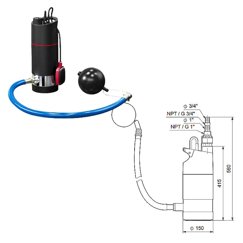 The pump is equipped with a side inlet/flexible hose with floating suction strainer.